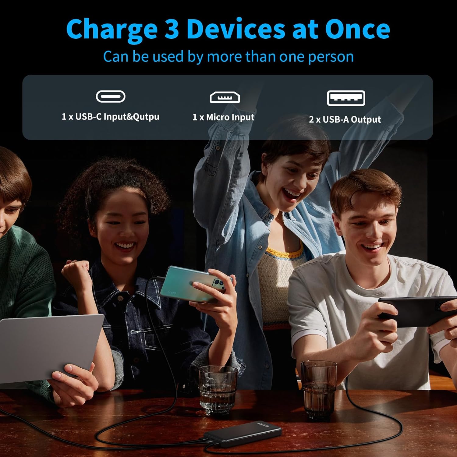 - Charge three devices simultaneously Power bank fast charging can charge a iPhone, a iPad mini and a Airpods Pro at the same time. Lets you share portable battery pack with family and friends anywhere, anytime