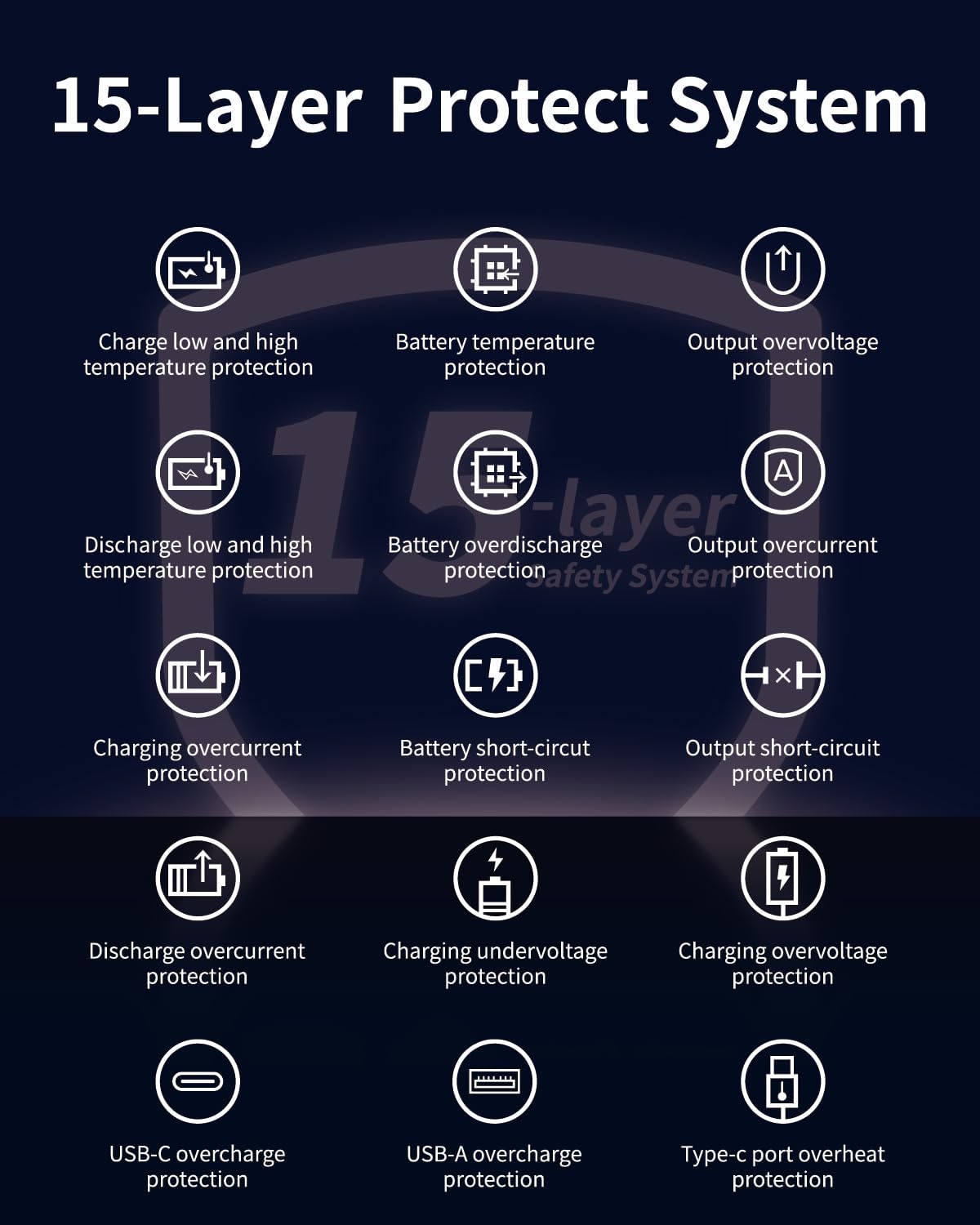 - 15-Layer Protect Our Multi Protect system combines high-voltage protection, current regulation, temperature control, and more to keep you and your devices safe. And the built-in lithium polymer batteries adhere to the highest safety and quality standards to ensure complete safety for you and your devices.