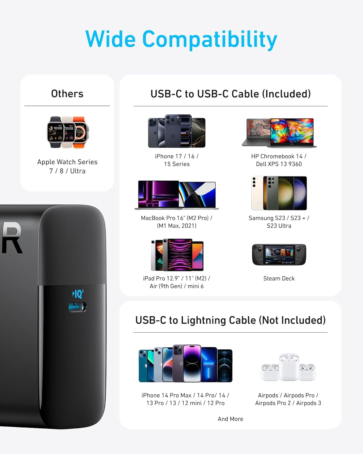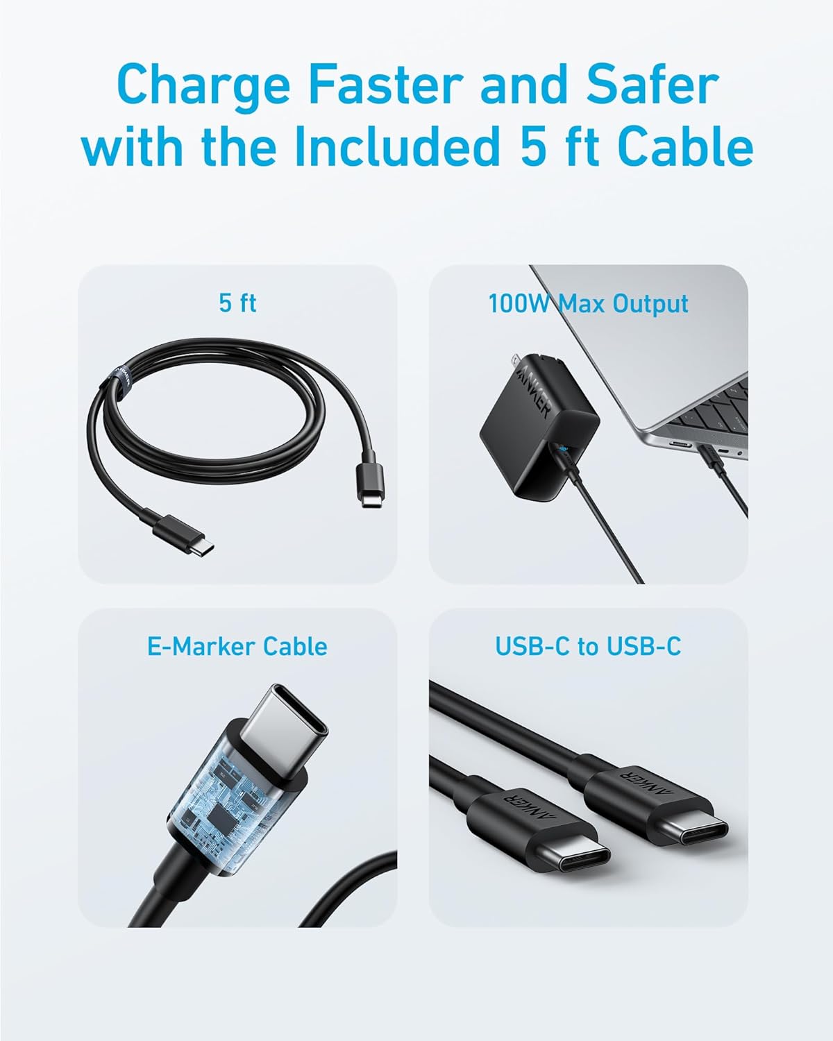 - What You Get: Anker 317 Charger (100W), 5ft / 1.5m USB C to USB C cable (placed behind the plastic tray compartment), welcome guide, our worry-free 18-month warranty, and friendly customer service.